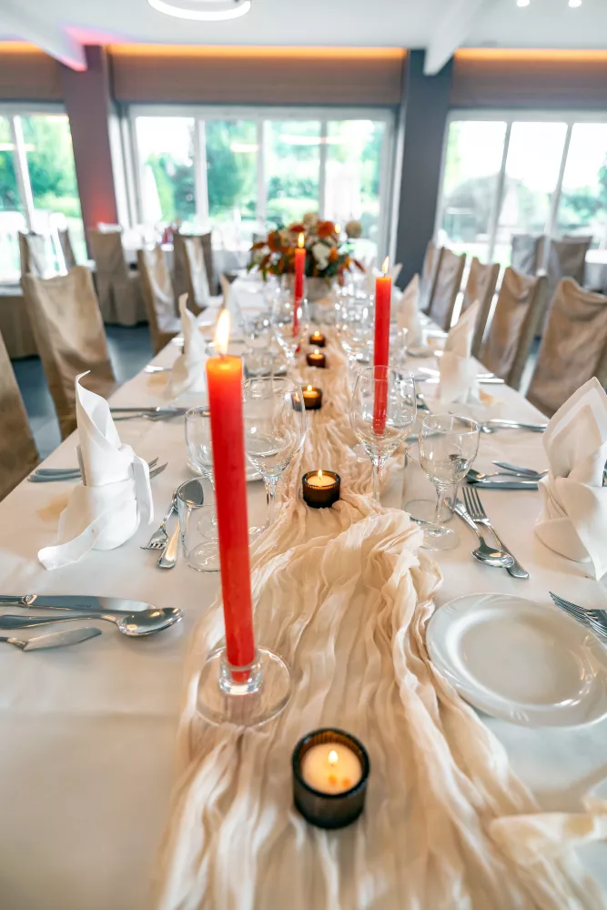 Chemin de table beige, au tombé fluide et élégant.