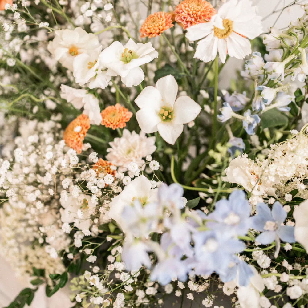 La composition de cheminée habille cet élément architectural avec légèreté et équilibre. Réalisée à partir de fleurs fraîches, elle apporte une touche végétale élégante qui s’intègre naturellement à la décoration du lieu de réception.